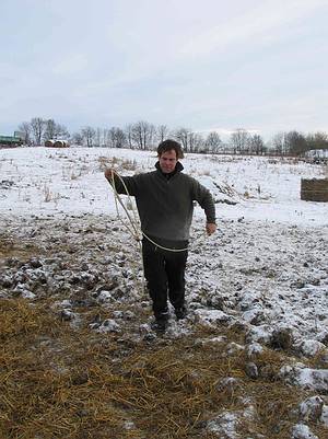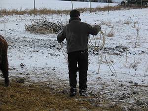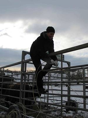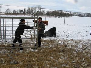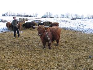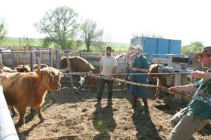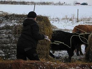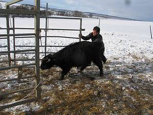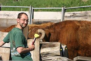 Wir haben immer Arbeiten auf dem Feld, sei es das Umstellen der Mädels, das Piercen der Neugeborenen oder einmal das Neuanbringen einer verlorenen Ohrmarke an unserem Zuchtbullen. Der steht auf sowas.